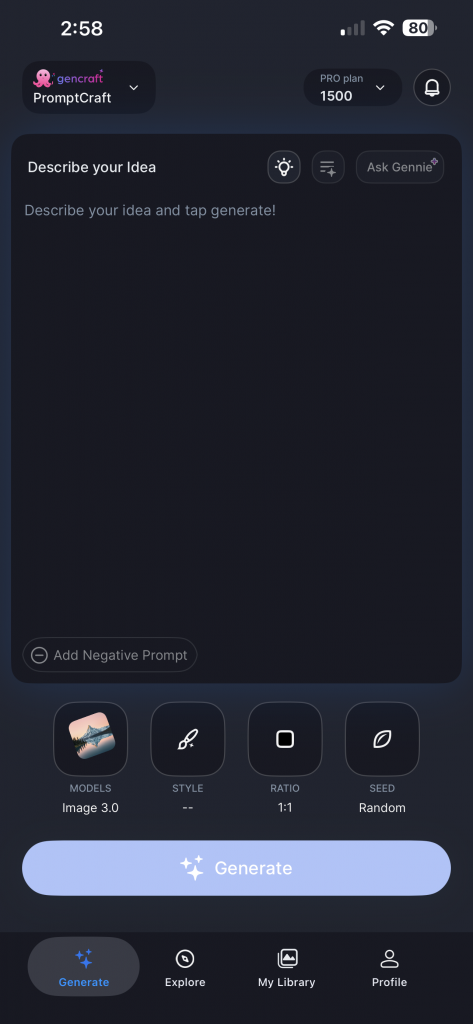 The new generate screen presents a simplified UI that emphasizes the prompt input, which is the most important element for creation. Optional inputs, like reference images, are hidden unless required for the selected feature. We want users to be able to generate quickly without extraneous UI elements.