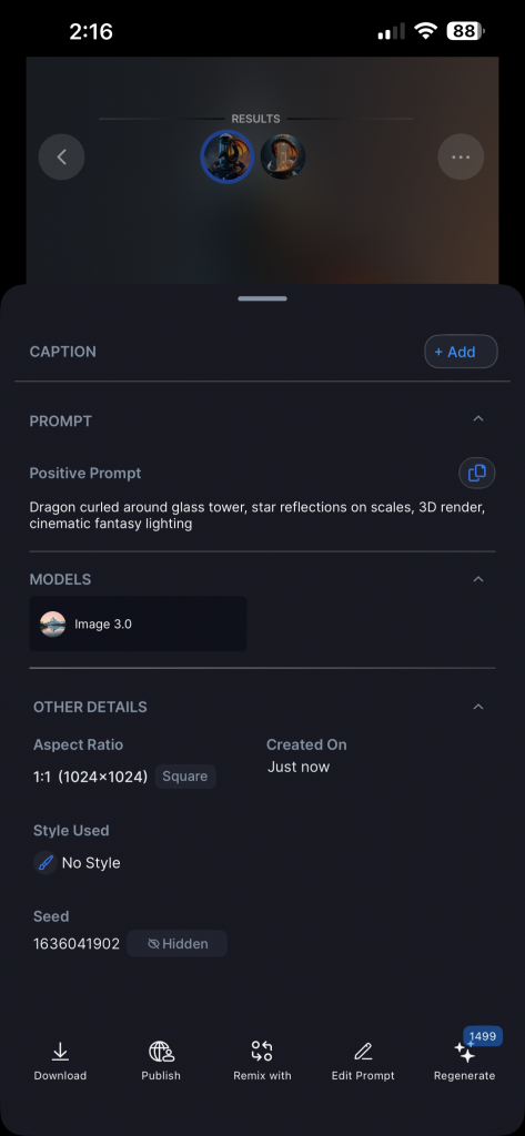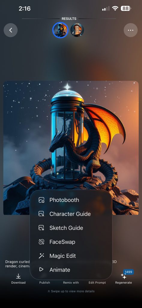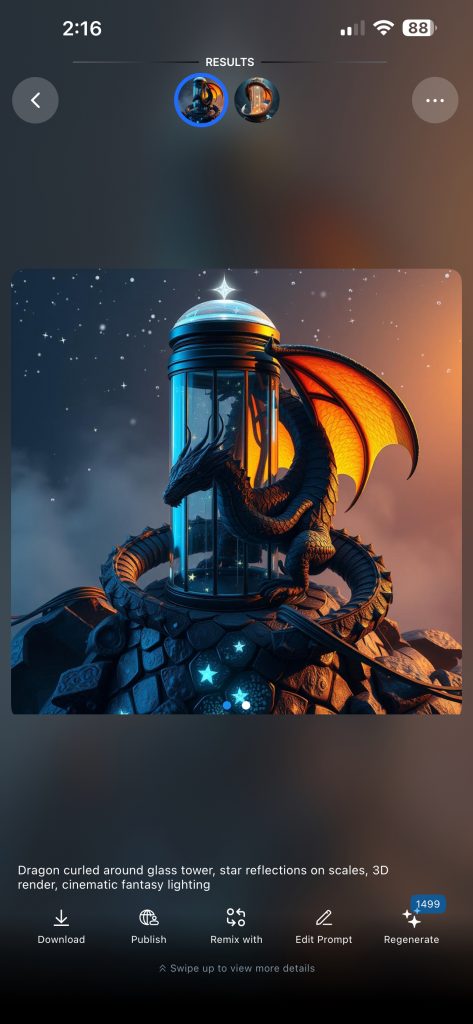 The new creation results screen brings more focus to the actual creation, which is now larger and more prominent. Swipe left and right to navigate between both creations, and swipe up to view the full details for the creations. Key actions like remixing, publishing and downloading are still one tap away, but are now consistently organized in the UI.