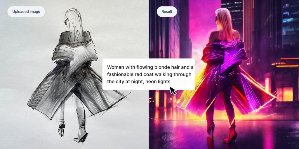 In the example below, we took a pencil sketch of a woman in a fancy coat and heels and added a neon color palette and cityscape background. Notice how the model has preserved all details from the original sketch, from pose to sunglasses.