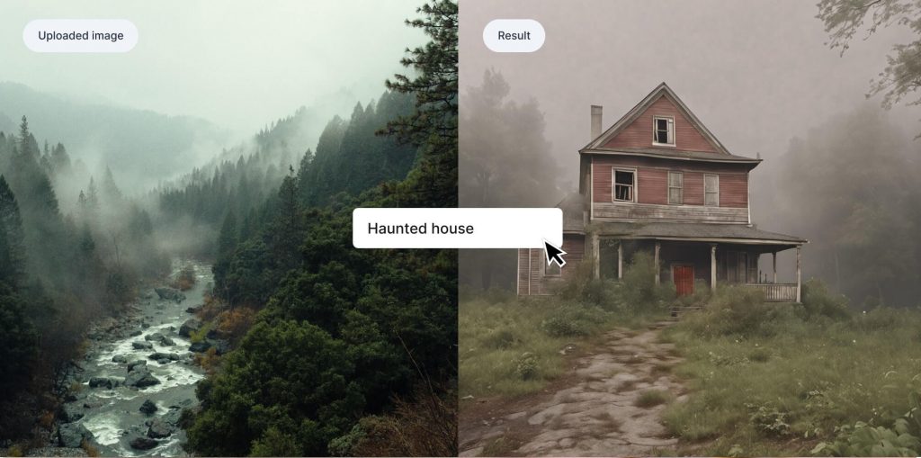 Using a landscape as a sketch guide also works to specify a certain image composition for images that are completely unrelated to your prompt. In the next example, the uploaded image is of a river running through a very foggy forest. When used with the prompt “Haunted house,” the resulting image has transformed the river into a path and maintains the same areas of the photo that are land and trees versus fog and sky.
