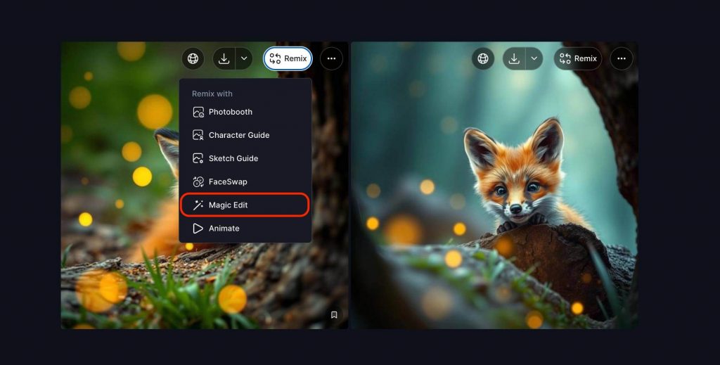 Find the image you want to tweak in My Creations OR My Uploads and click Magic Edit. When viewing My Creations, you can find the Magic Edit option in the Remix Option Dropdown.